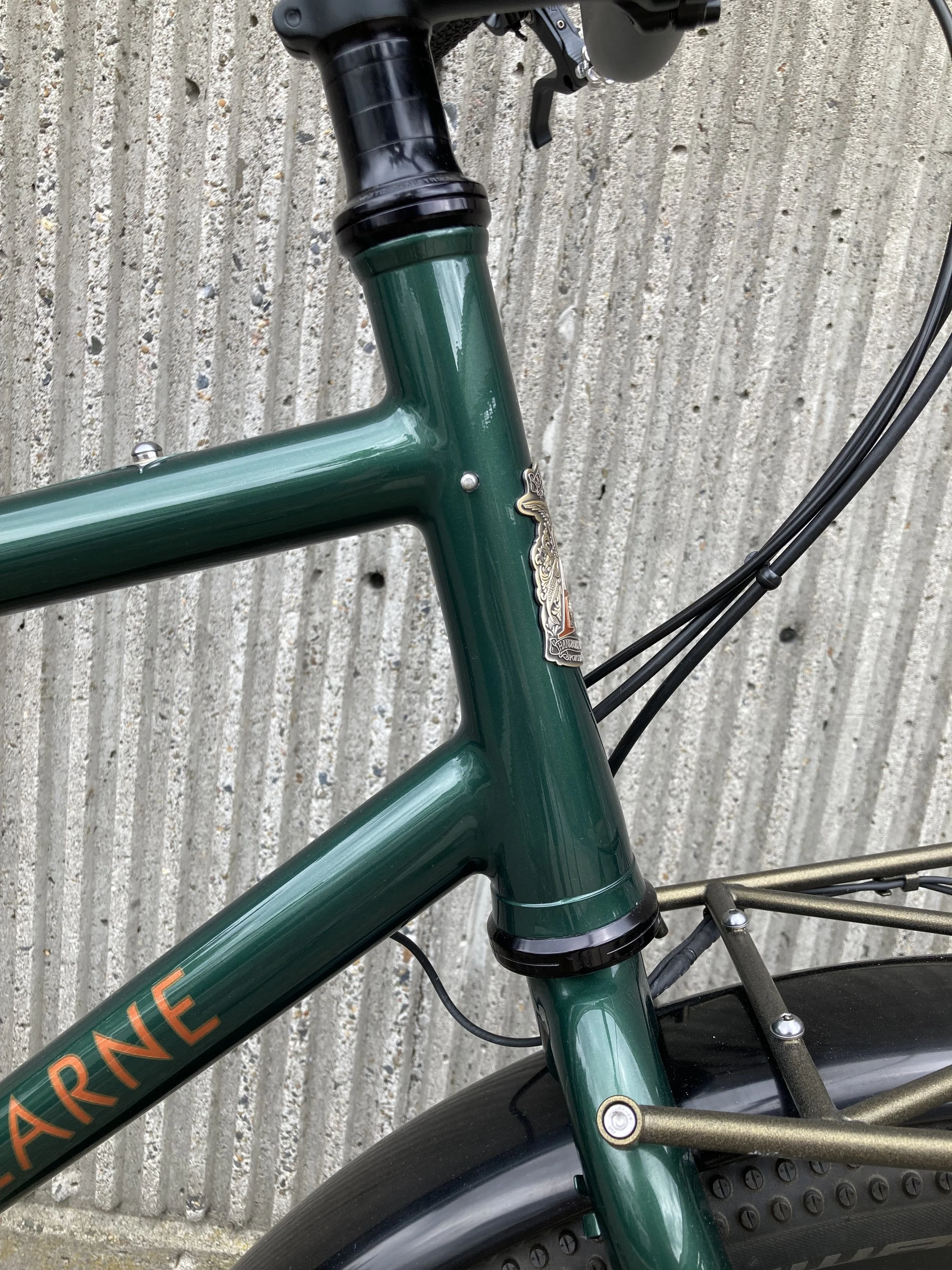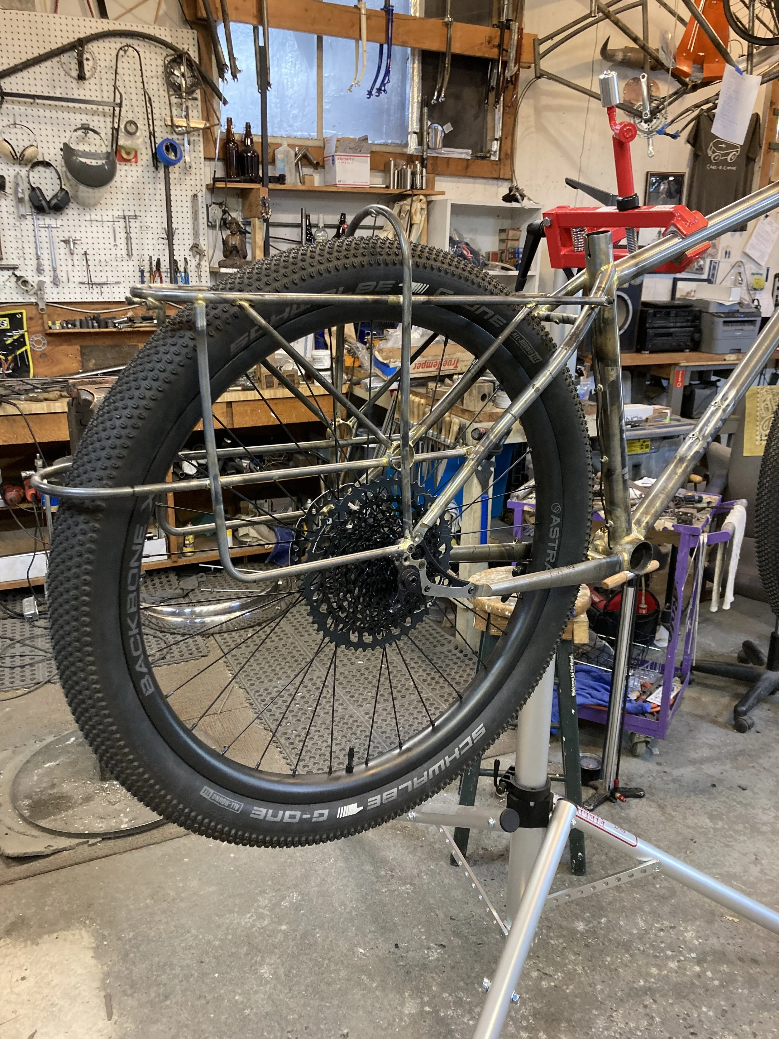 The bike is currently set up with a 90 mm stem and the Ahearne “Uprising” bar. There is a lot room to adjust the reach by either swapping the stem or changing out the type of handlebar, or both. Also, I left the full length steerer and added a few spacers which could be removed and the steerer cut down by a few centimeters if desired.