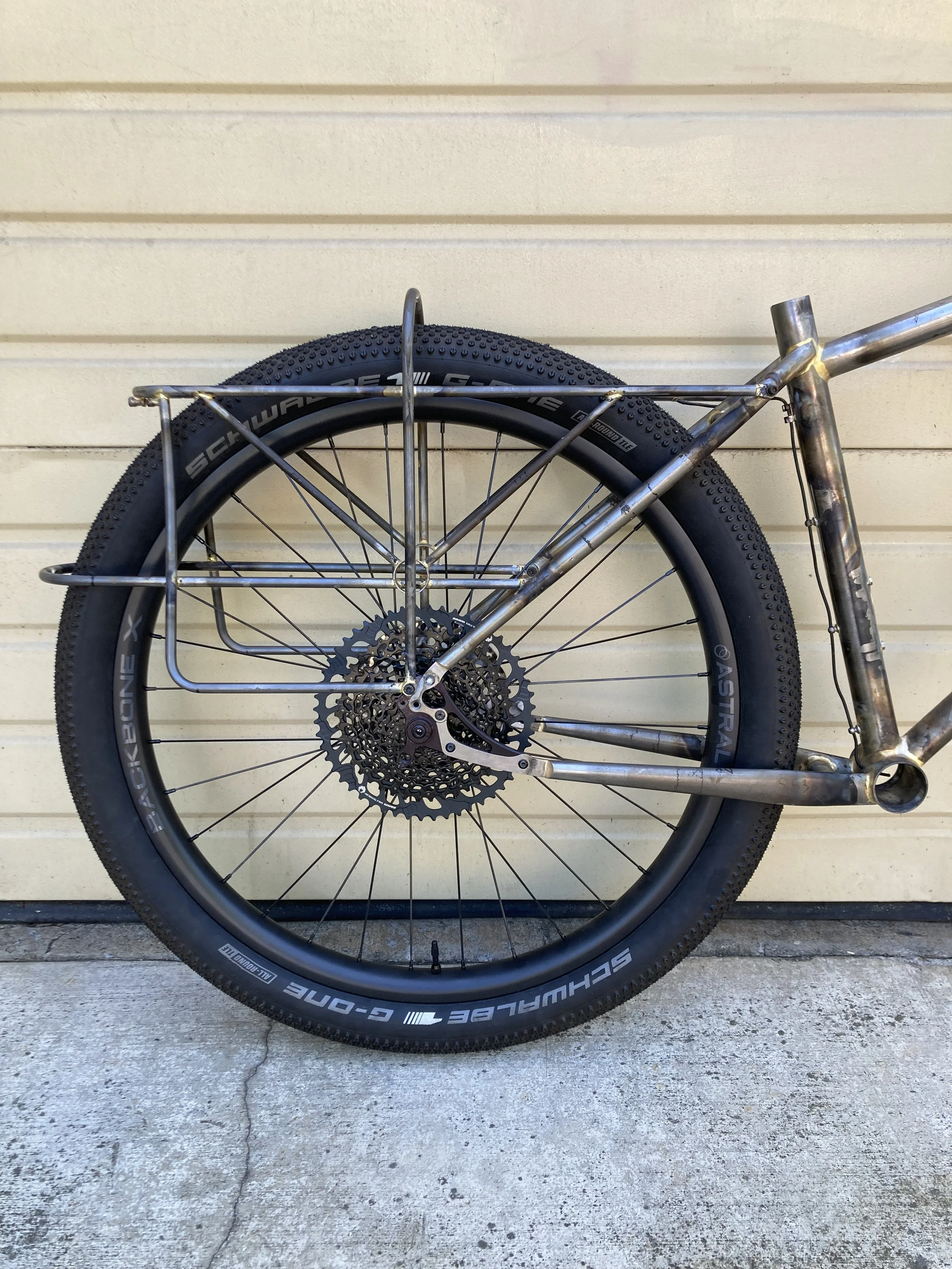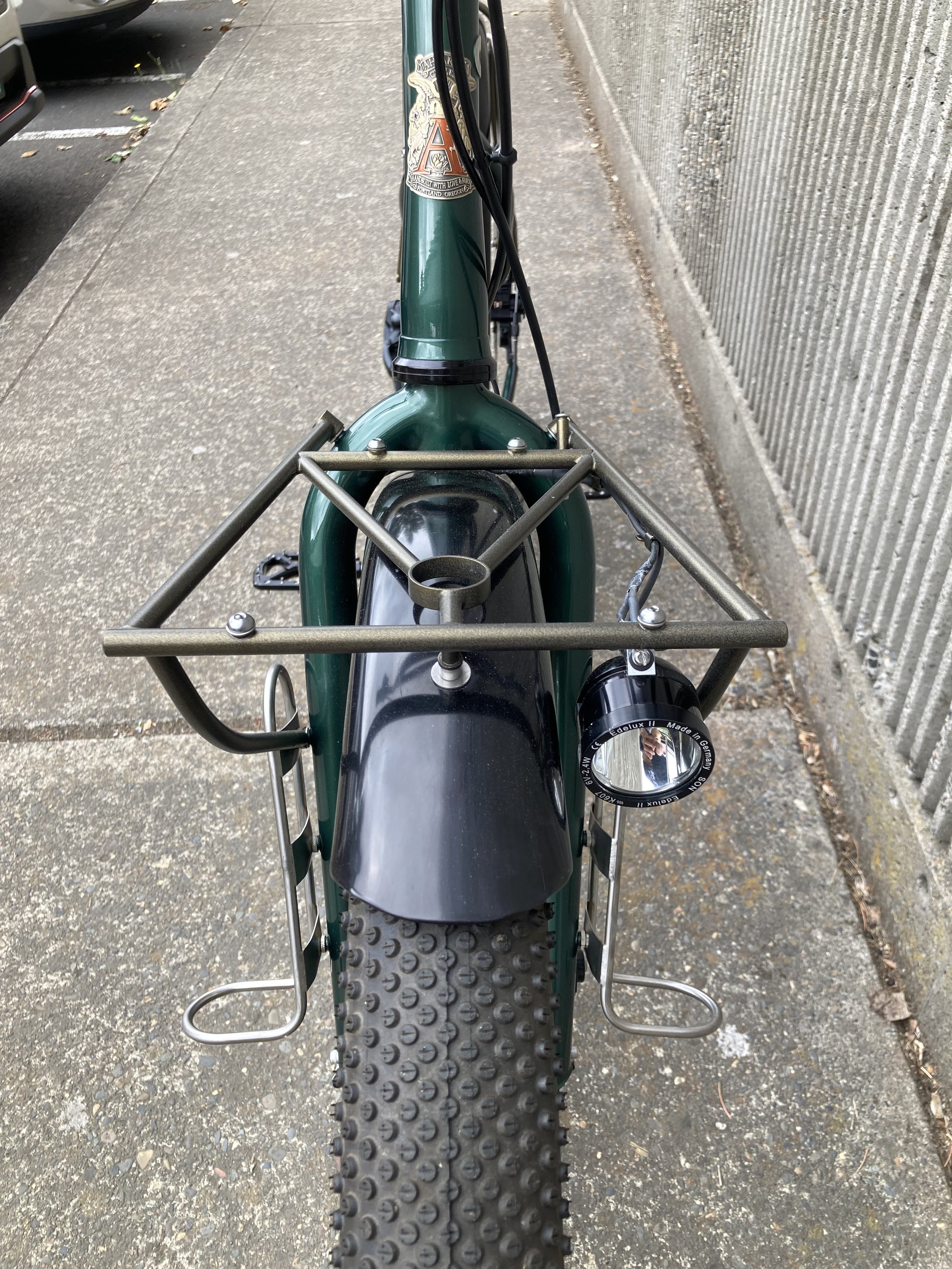 The main point here is that the rack spacing helps make a clean, round fender line and mimics clearance of the front wheel. Also, the rear rack was built around the Rockgeist “Microwave” pannier set (not included). This is one of the lightest, most stable bag systems for all-road touring.