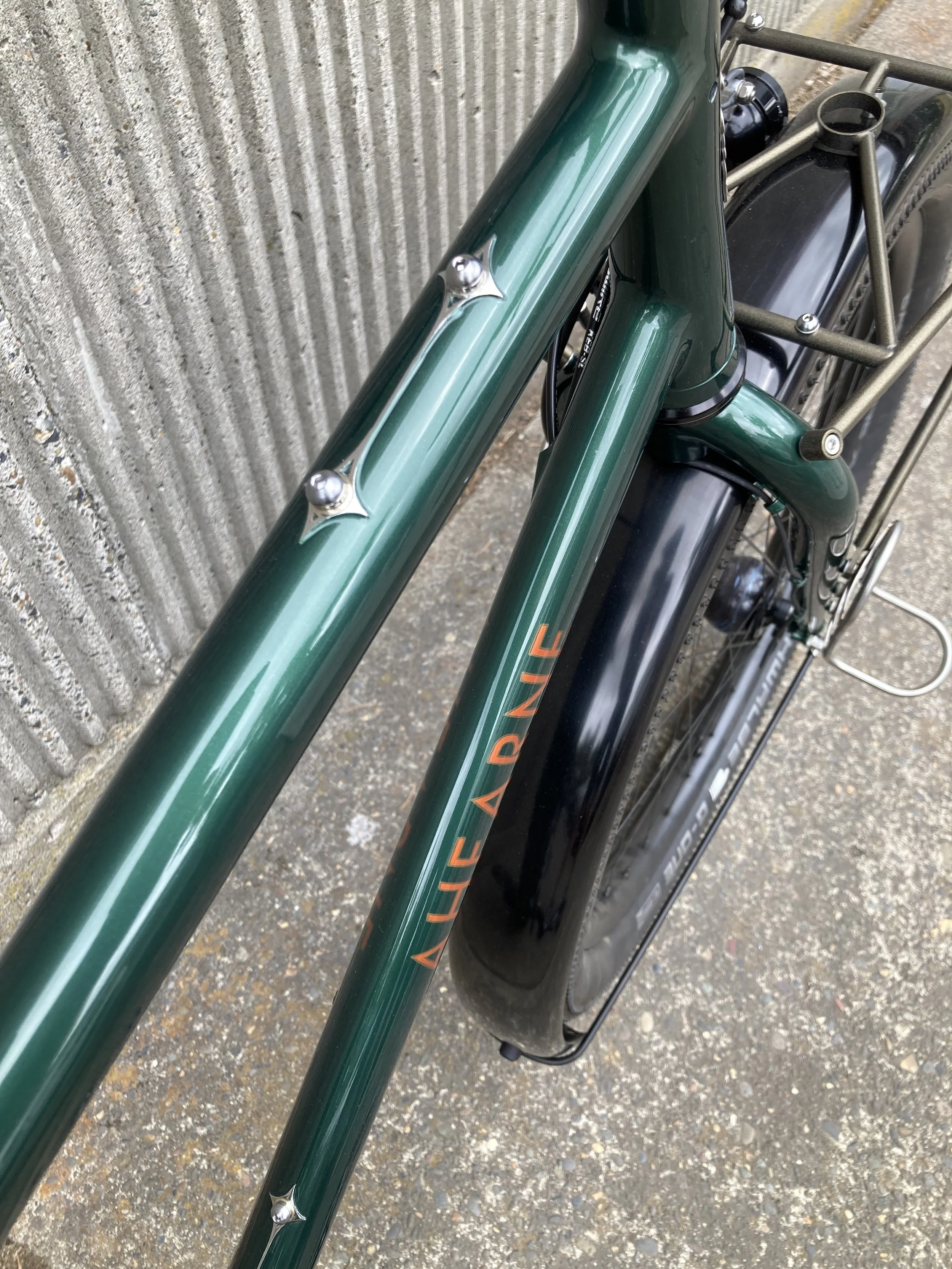 A part of the bike that really stands out for me is the rear rack. I love a touring rack design that fits seamlessly with the frame and fender. This one is light, especially for what it can carry, and very stable. It encases the fender, and each of the four mounting points on the fender are exactly, evenly spaced, which is a small, nerdy thing that perhaps only another bike builder would notice, but it makes me exceedingly happy.