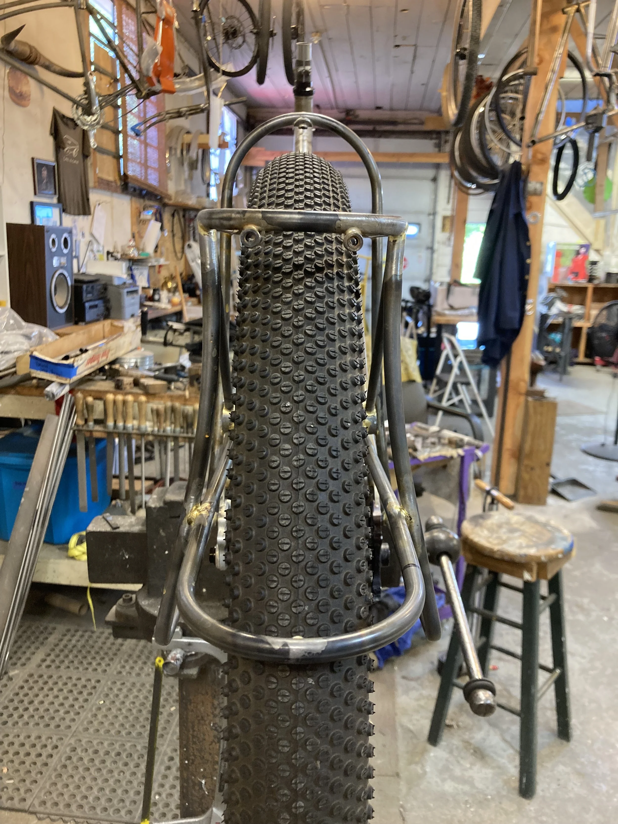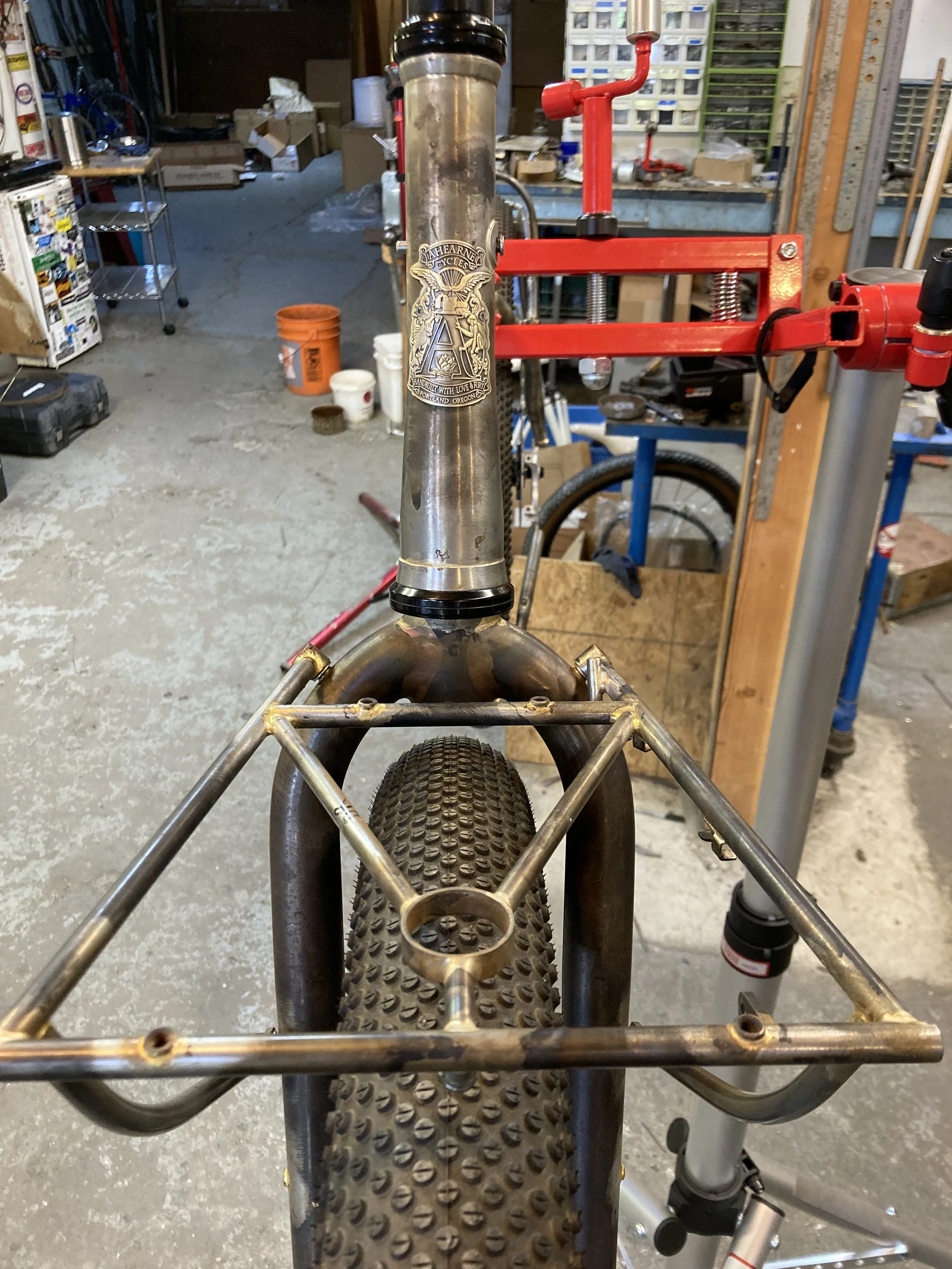 This truly is a special bike, one that carries some history. It was the final bike I built at the Page Street workshop before I had to move. Even the individual tubes that make the frame have stories behind them. It’s a bike I’ve had brewing in my mind for the past two or three years, and slowly I’d gathered, parts, materials and ideas, waiting for the right time to construct it. The 2024 Made PDX bike show gave me the excuse I needed. And when I’m building a bike for a show I always tend to take it to the limit. This one is no exception.