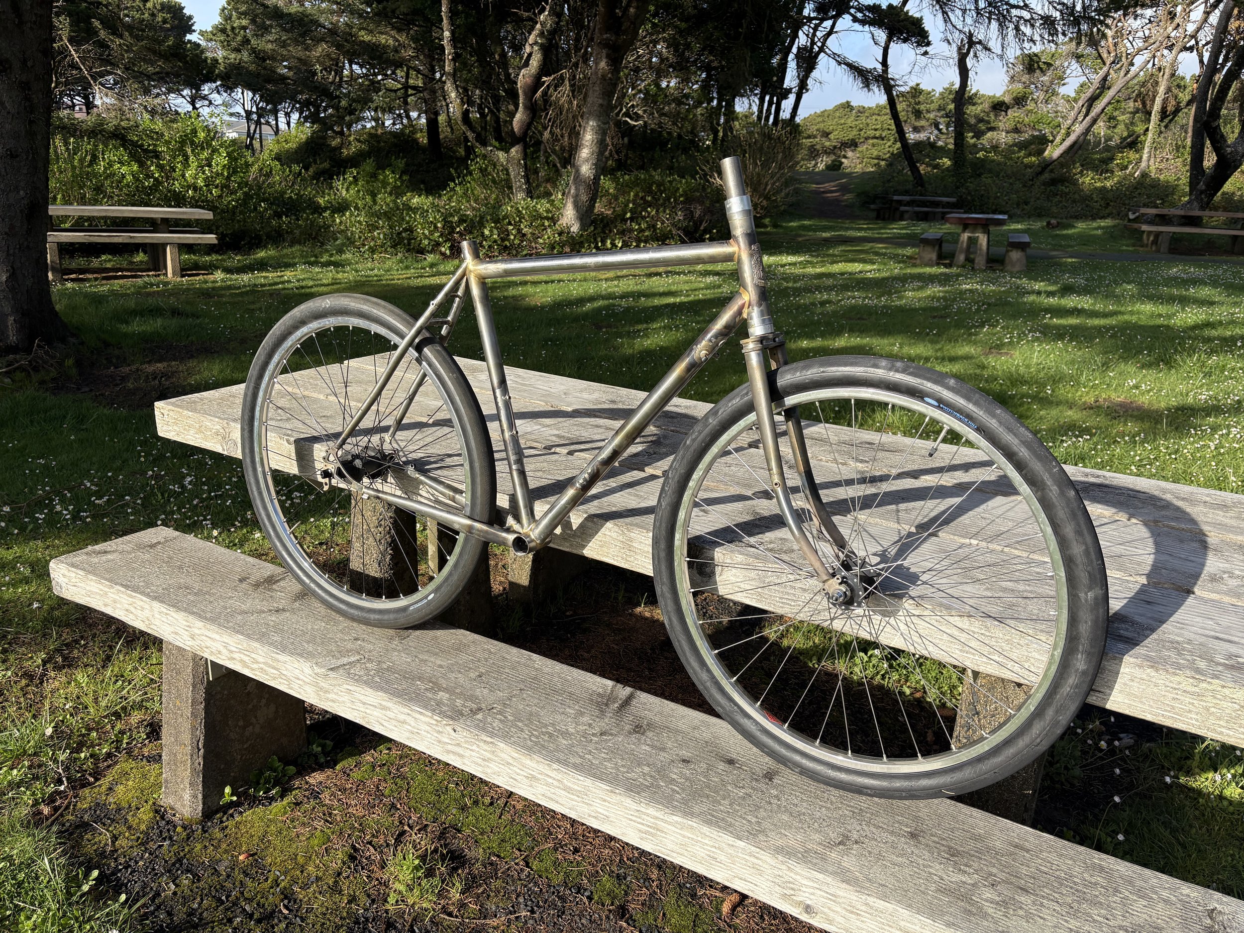 Frame and fork cost is $3650, which is about 25% less than a full custom frame set. The best part is, if this one fits you, you get all the benefits of a custom bike and don’t have to wait. Except for paint, this one is ready to roll. If you have any questions about the size and fit, again, please get in touch.
