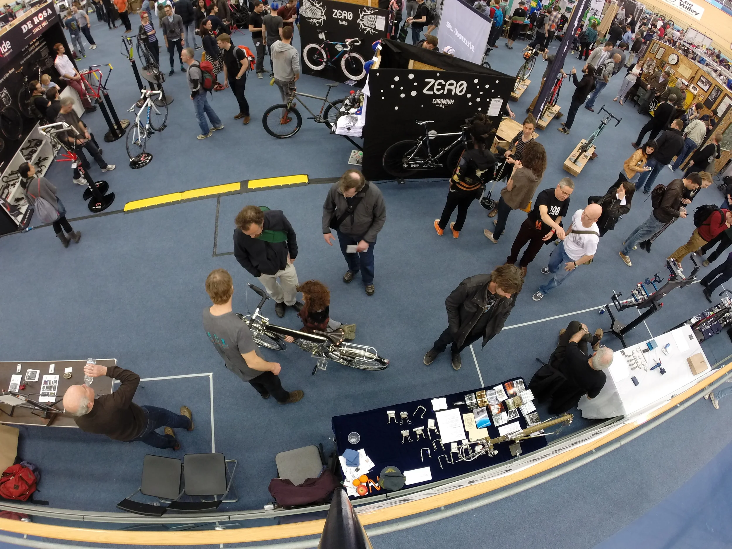 The show was well attended, for sure. I took a couple of time lapse videos that show the surge of people during the peak times. The show was spread over three days from a Friday. By the afternoon of each day, as my voice started to give out from having spent the day talking over the heightened decibels from the crowd buzz, I could see in people’s eyes a spiraling glaze forming. The number of pretty bikes one person can look at in a day depends upon that person’s constitution. I’d give most averagely bike hungry individuals 2.5 hours of relatively continuous active interest before cogs, stays, tubes, angles, features and head badges begin to vibrate and swirly in an exhausted mesmeric pull toward somnambulism.