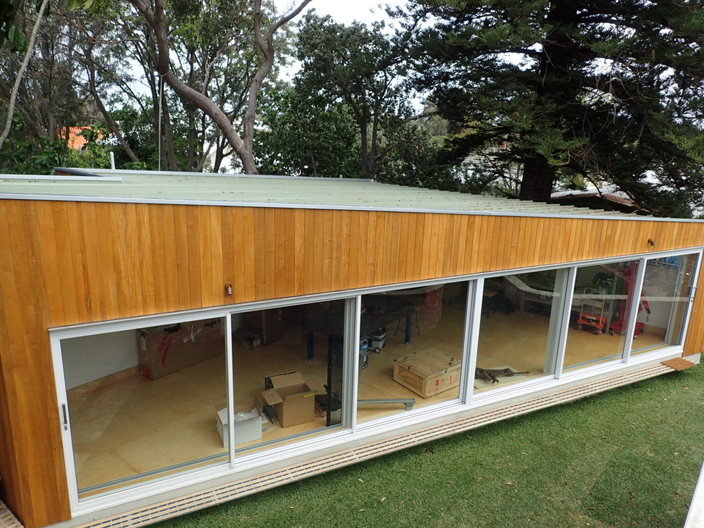 The workshop is gorgeous. It’s behind the house, is an asymmetric design, kind of wedge-shaped, which fits well with the huge Norfolk pine and the “flow” of the back garden. The inside of the workshop is I’d guess about 7 or 800 square feet, has it’s own water-efficient toilet, two deep stainless steel sinks, a small area which will eventually be a paint booth, and is stocked with most all of the tools needed to build bikes. Jesse and I have been talking over the past couple of years about