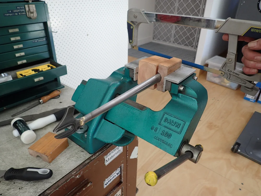 But I’m getting side-tracked. Tools & tables. Building a first bike in a brand new workshop with new tools, you’ve got to expect to run into difficulties, so-called bumps in the road. And we did. We had to make a fork blade bender before we could start the fork. We had to fill the tanks and set up the torch and we then had to replace the faulty regulators. We had to buy silver and flux. I had to learn to braze with these new types of flux, figuring out their properties and heat-windows and all that. We had to figure out the abrasive system for mitering. Oh, and yes, we had to uncrate the frame jig and set it all up. Nice job packing the crate, by the way, Don Ferris. Seems like you’ve spent some time figuring that process out. We had to design a bike around the lugs that Jesse already had in his possession. We had to guess at the lug’s actual angles, because Jesse bought them off a guy who used to build bikes quite a while ago and there was no finding the guy now, not on the internet or otherwise. Japanese track lugs, not like any I’ve seen, exactly. We made an educated guess at the angles. We had to order more bits from Ceeway in England; tubes, steerers, braze-ons, etc., and wait for them to come before we could finish off the bike.