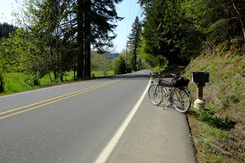 A few miles back the way I’d come and some twist of luck allowed me to find the turn on the GPS. I was convinced I was going to have to head many more miles back to the road and take that over the hills. This one bit of navigational help made having the GPS worthwhile. A mile or two down the turnoff and the road seems to end. Btu keep going. Over a mound of dirt and there’s a steep and rutted trail that takes you down to a dead end country road, paved. And in a couple more miles you’re in Vernonia.