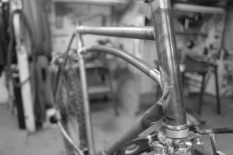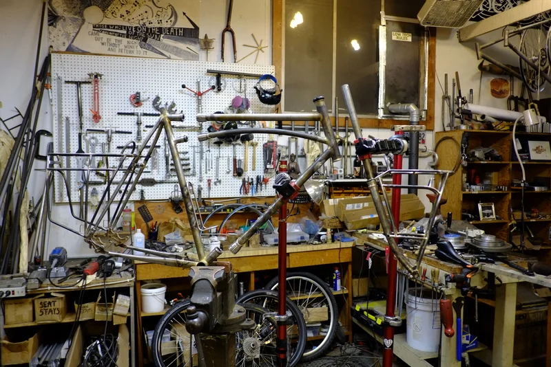 This bike is very custom, and is ready for anything. The list of features includes: 26" wheels, Rohloff 14 speed internally geared rear hub, Gates Carbon belt drive, Paul "Klamper" disc brakes, Supernova lights powered by a Schmidt front generator hub, internal wiring throughout. On top of the stem is the Supernova "Plug" which is a USB port to charge small devices from the power of the front hub. The bike has S&S couplers so it can be broken down for easier transport on airplanes etc. The racks are custom, steel, made in house. The fenders have very nice and understated striping, and the offset color of the racks is a quiet nod to the custom aesthetic. Keefer's bike is ready to hit the road for the long haul.